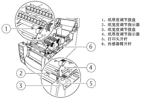 1.4 熱敏打印頭/傳感器臂/可調(diào)節(jié)(后)傳感器/固定紙傳感器/左紙導板/右可移動紙導板/卷軸/可調(diào)節(jié)傳感器位置撥盤