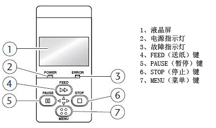 1.5 液晶屏/電源指示燈/故障指示燈/FEED(送紙)鍵/PAUSE(暫停)鍵/STOP(停止)鍵/MENU(菜單)鍵